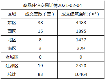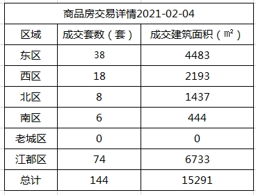2月3日扬州商品房共成交144套,成交建筑面积为15291㎡,东区成交38套,西区成交18套,北区成交8套,南区成交6套,老城区成交0套,江都区成交74套;其中商品住宅成交83套,成交建筑面积为10464㎡。