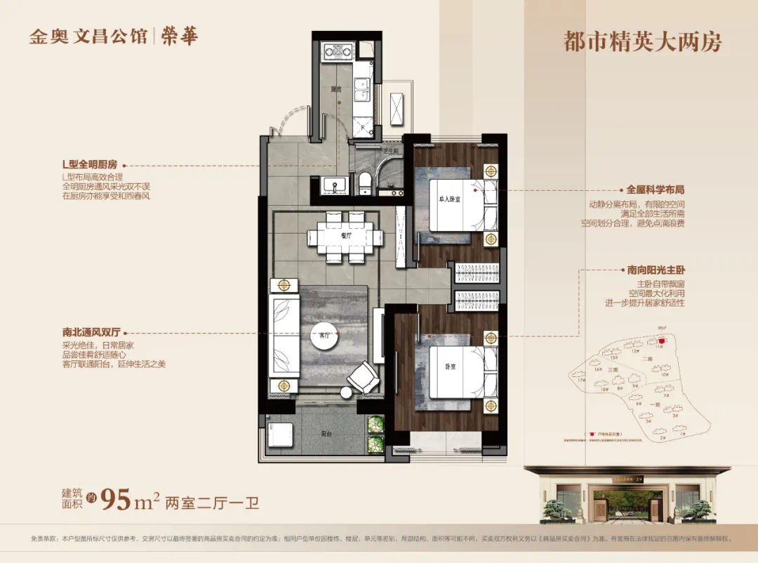 建面约95㎡>和上一个户型相比,虽然少了一个卫生间和客厅面积,但总价更低,非常适合二人世界和一家三口。