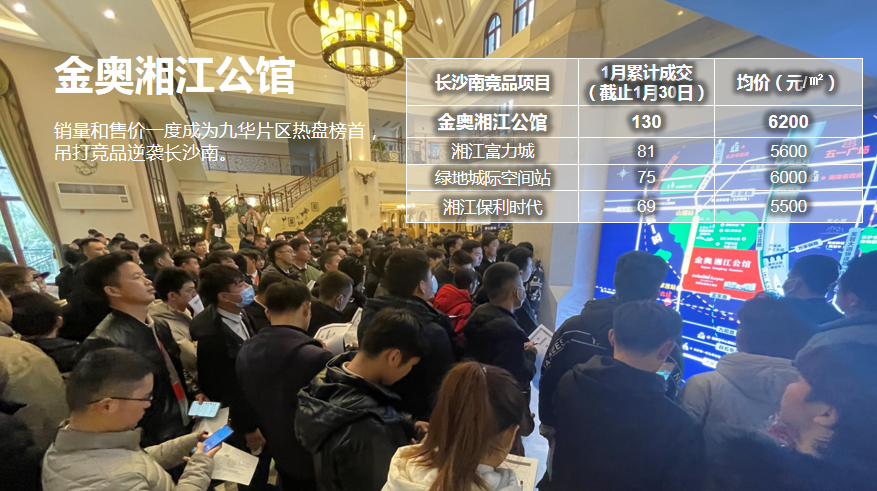 2021年1月,金奥湘江公馆在均价为6200元/平,超竞品均价的情况下,累计成交130套,超出区域竞品约60套之多。