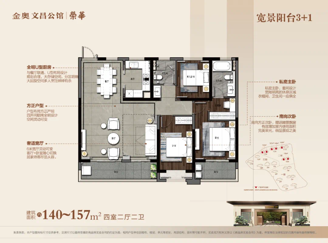 建面约140-157㎡>这个面积段的户型同样非常灵活,如果家庭成员比较多,那么可以做成四个房间;如果喜欢宽厅,可以将与客厅连接的次卧打通,生活品质感会迅速提升!
