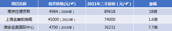 南京拉德芳斯、上海金巢铂瑞阁、淮安金奥中心,从进入城市首开,截止目前,引导周边二手房市场涨幅最高18倍。
