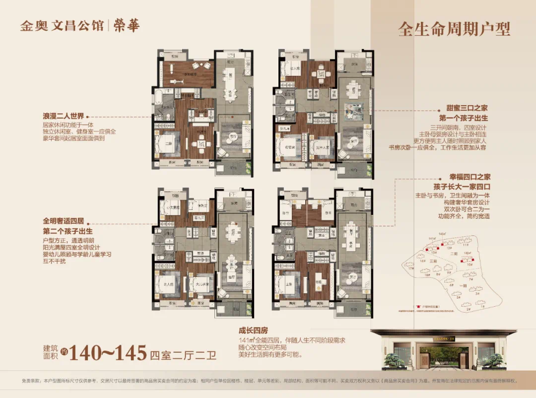 建面约140-145㎡>这是一个全生命周期的产品,无论你是处于二人世界,还是三口之家,亦或是三代同堂,这个面积段的户型都能满足。房间的多功能性和灵活性在这里得到了充分的体现,书房、儿童房、娱乐房等等,只要你想,这里都能做到。