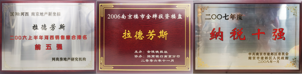 南京金奥拉德芳斯荣获“2006年 河西销售综合排名前五强 ”“2006年度 南京楼市金牌投资楼盘”称号,同时,凭借超高的市场认可度,被评为南京市建邺区 “2007年度纳税十强”。