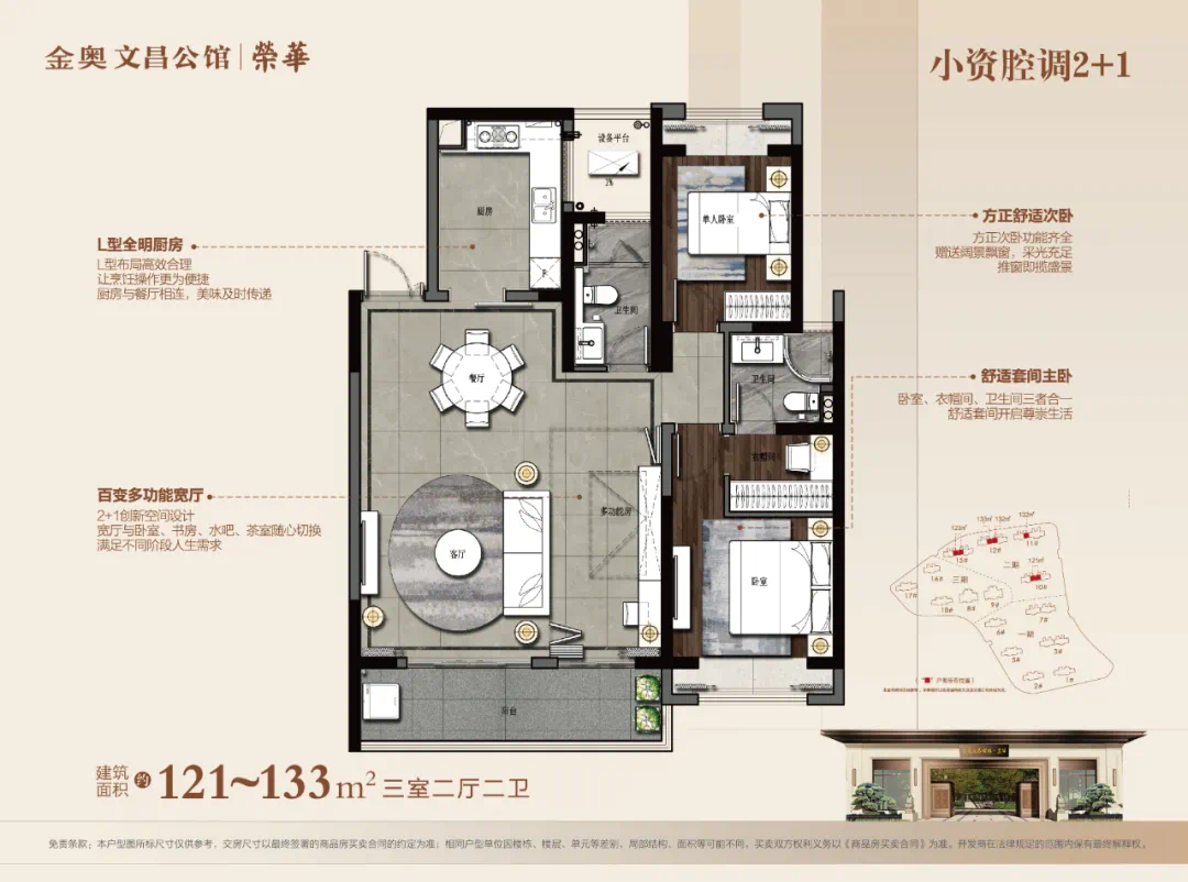 建面约121-133㎡>这个面积段的户型也是比较灵活,可两房可三房,但这个面积段的户型是最稀缺的,卖一套少一套。